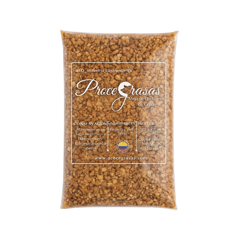 Nuestra miga de chicharrón es 100% natural, se obtiene como subproducto de la cocción de la manteca de cerdo, mezclado con piel de cerdo en trocitos para aumentar su crocancia.