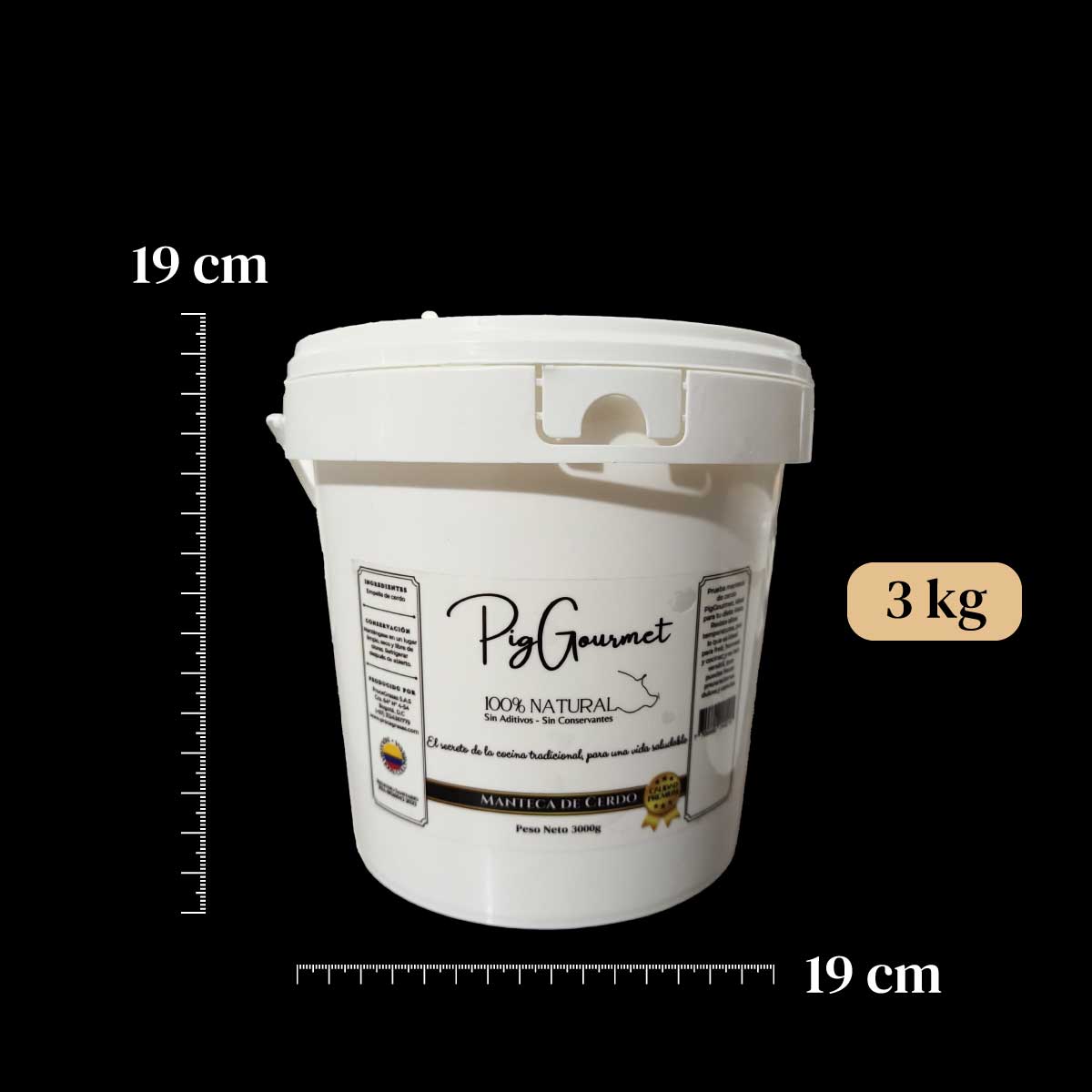 La manteca de cerdo x 3 Kilos de PigGourmet, es 100% natural, no contiene aditivos ni conservantes y no es sometida a procesos químicos para desodorizar o blanquear. Se obtiene a partir del proceso de cocción lento de la empella de cerdo y posteriormente filtrada cuidadosamente para tener como resultado una manteca clarificada de la más alta calidad. El color de la manteca, varía de blanco a perlado e incluso un ligero amarillo, según lote de producción.